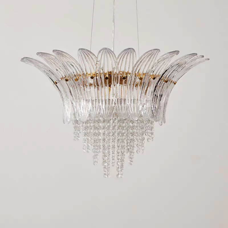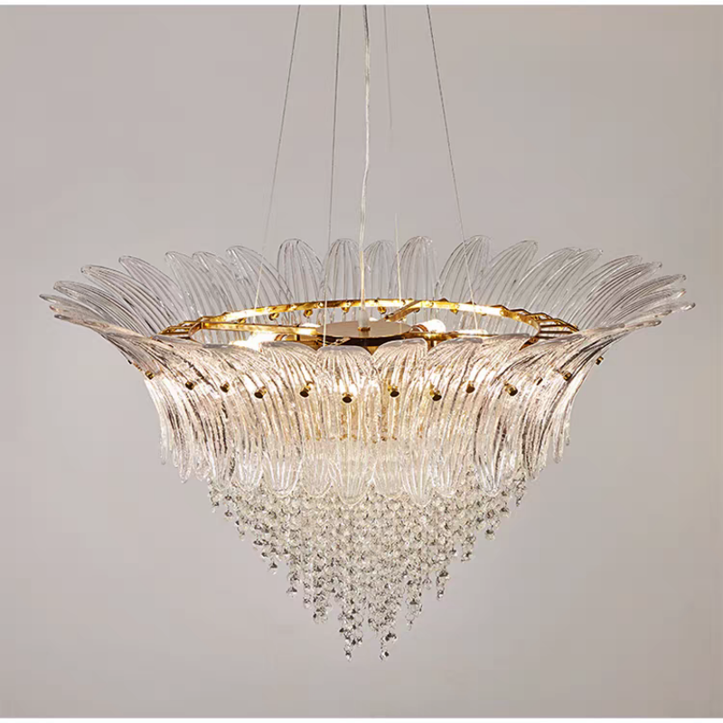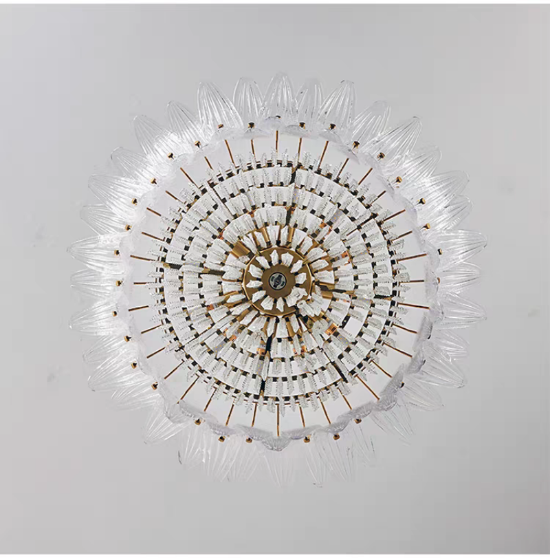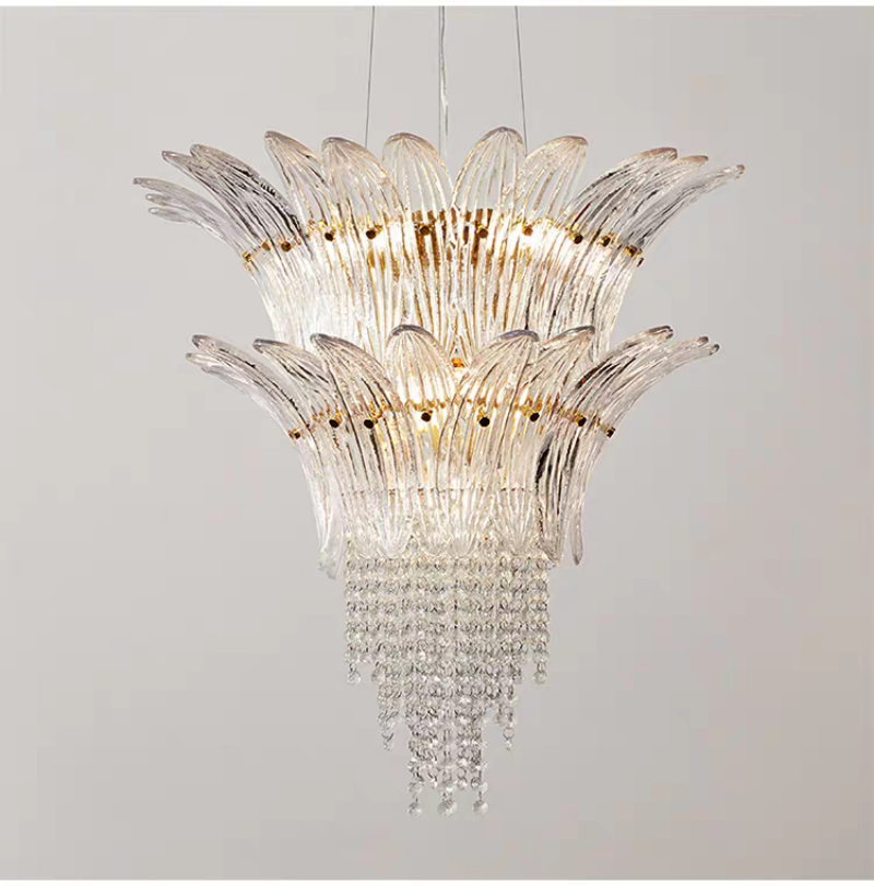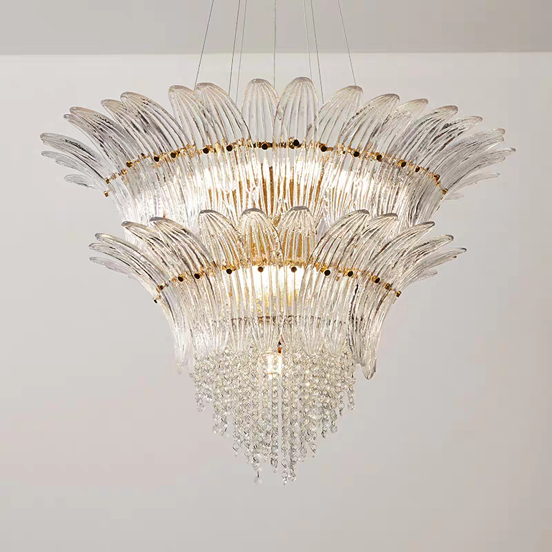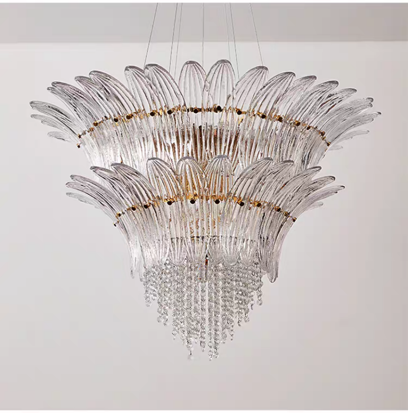 - Customizable Configuration and Luxurious Finishes: This pendant lamp is defined by its flexibility, offering both single-layer and double-layer designs in multiple diameters to perfectly suit your ceiling height and spatial requirements. The option to choose between a warm Copper finish or a minimalist transparent framework allows this pendant lamp to seamlessly integrate into your existing decor, whether it leans towards classic opulence or contemporary chic. Each component of this pendant lamp is crafted with precision, ensuring that the glass, crystal, and metal elements come together in harmonious elegance. The ability to custom order sizes makes this pendant lamp a truly personalized lighting solution.
