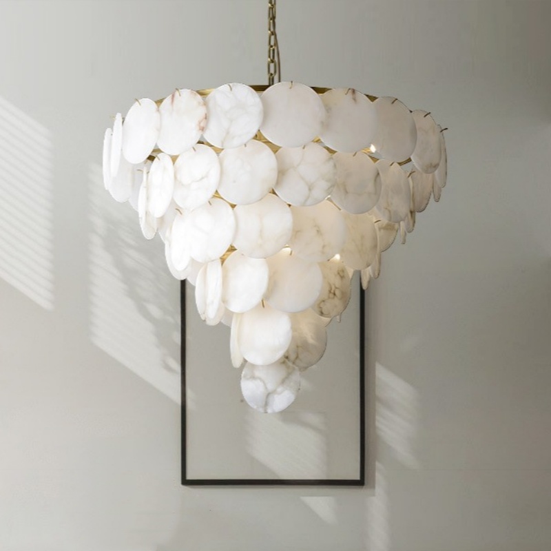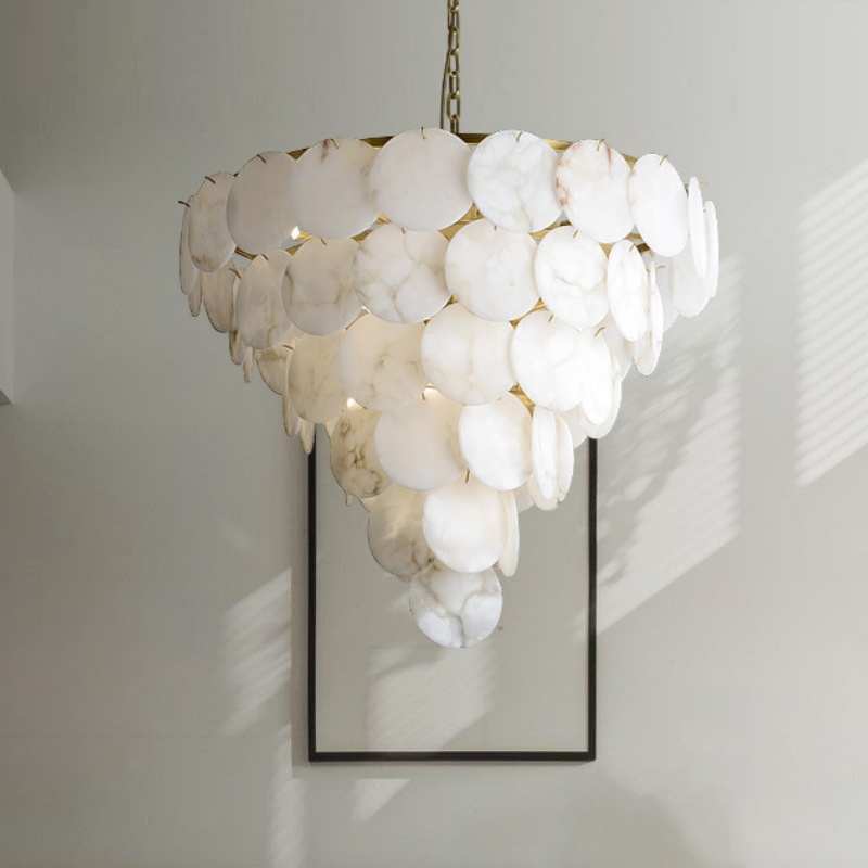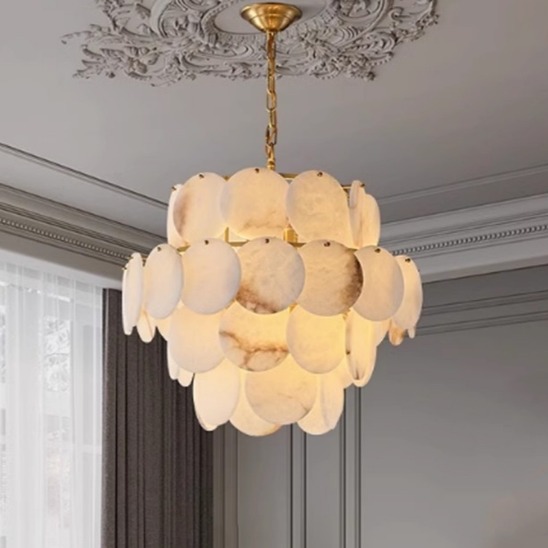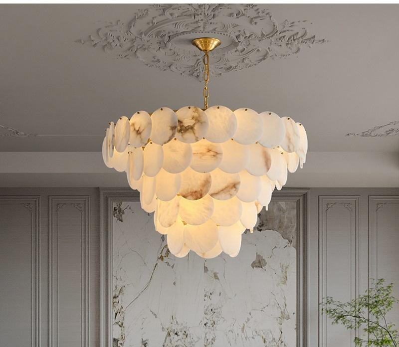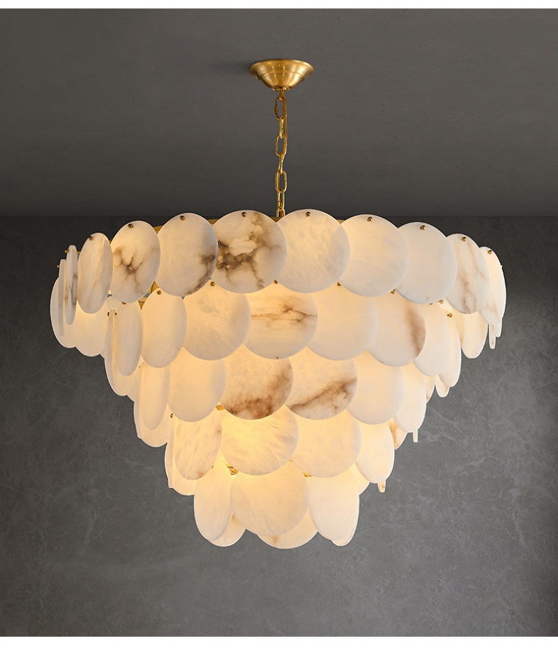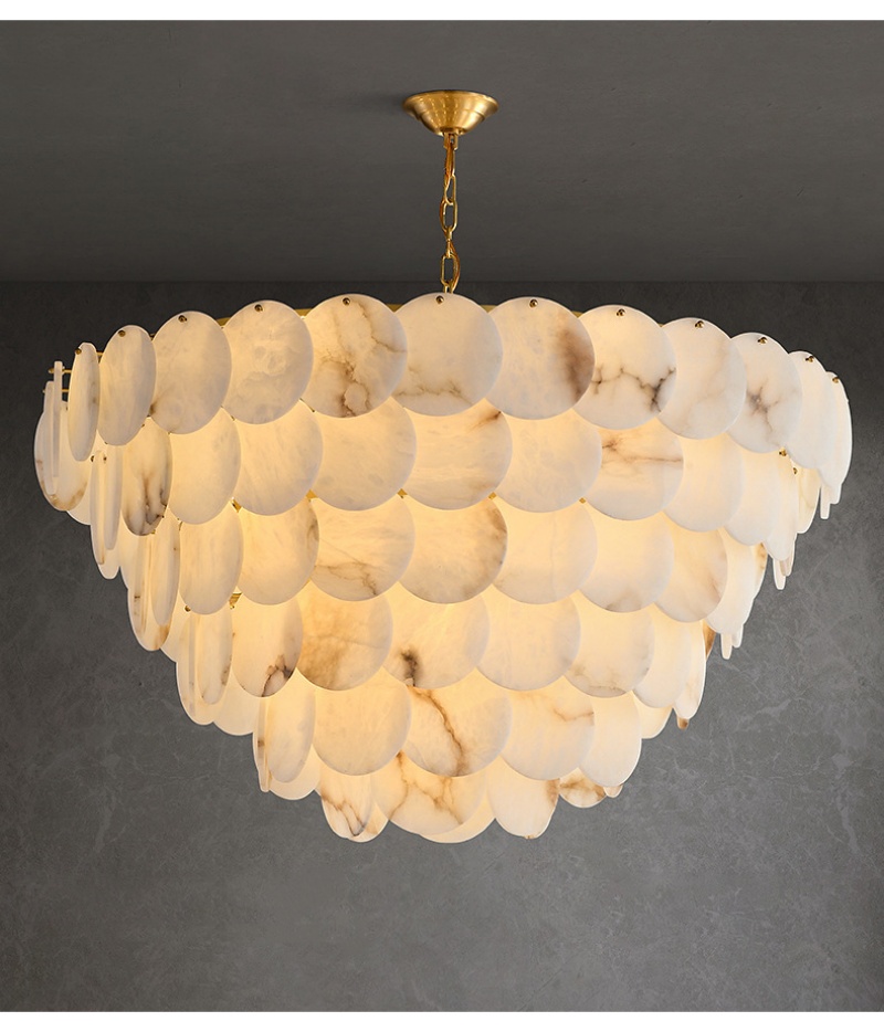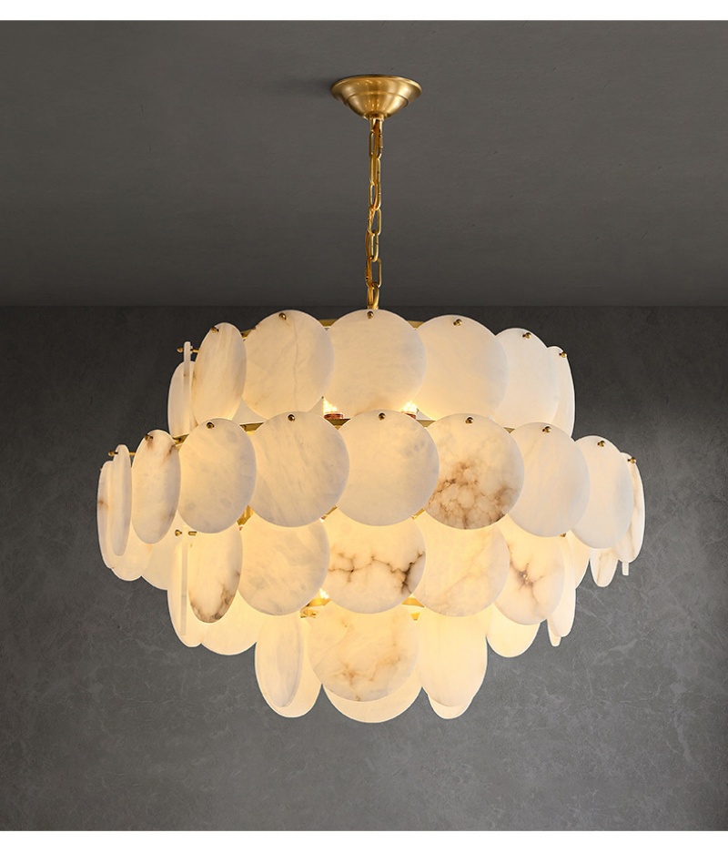 - Artistic Multi-Tier Design: This magnificent pendant lamp showcases an exquisite arrangement of 9 to 30 heads distributed across sophisticated two-tier to six-tier configurations, available in diameters ranging from D450mm to the grand D1100mm. Each tier of this marble alabaster copper pendant lamp is meticulously crafted to create a cascading visual effect that brings sculptural elegance to luxury spaces. The harmonious arrangement of heads in this pendant lamp ensures balanced illumination while serving as a stunning centerpiece for hotel lobbies, villa entrances, and spacious living areas.