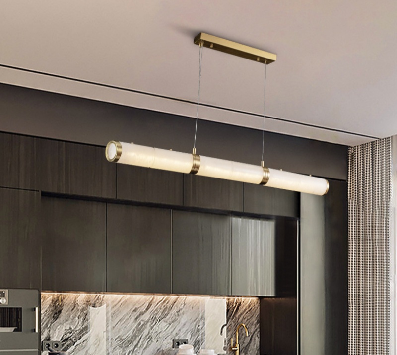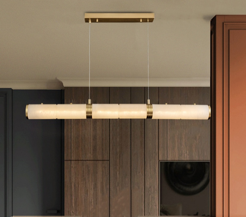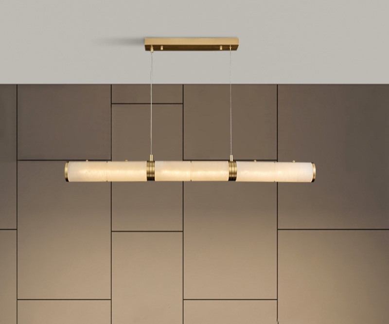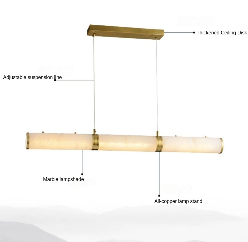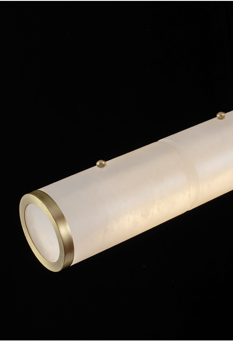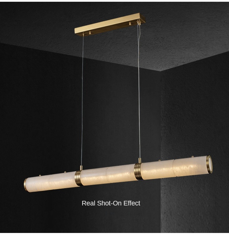 - A Sophisticated Material Contrast: Expertly crafted, this pendant light showcases a beautiful harmony between natural white alabaster and warm golden copper. The long cylindrical shade, made from solid alabaster, provides a soft, diffused glow, while the sleek copper hardware adds a touch of refined industrial charm. This pendant light is a testament to luxurious materiality, designed to become an instant focal point that elevates the aesthetic of living rooms, villas, and commercial spaces alike.