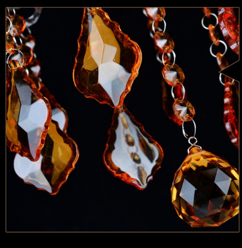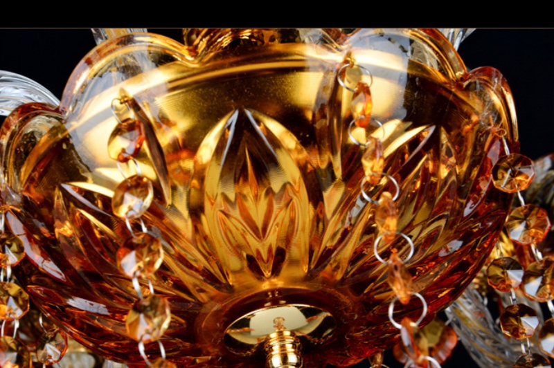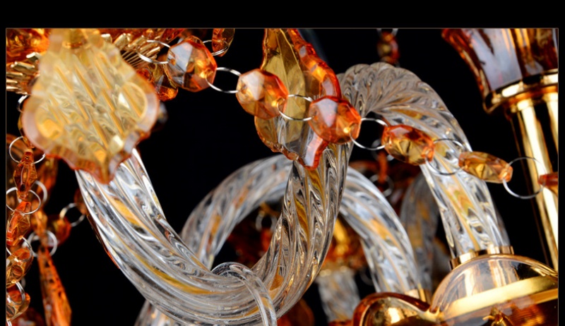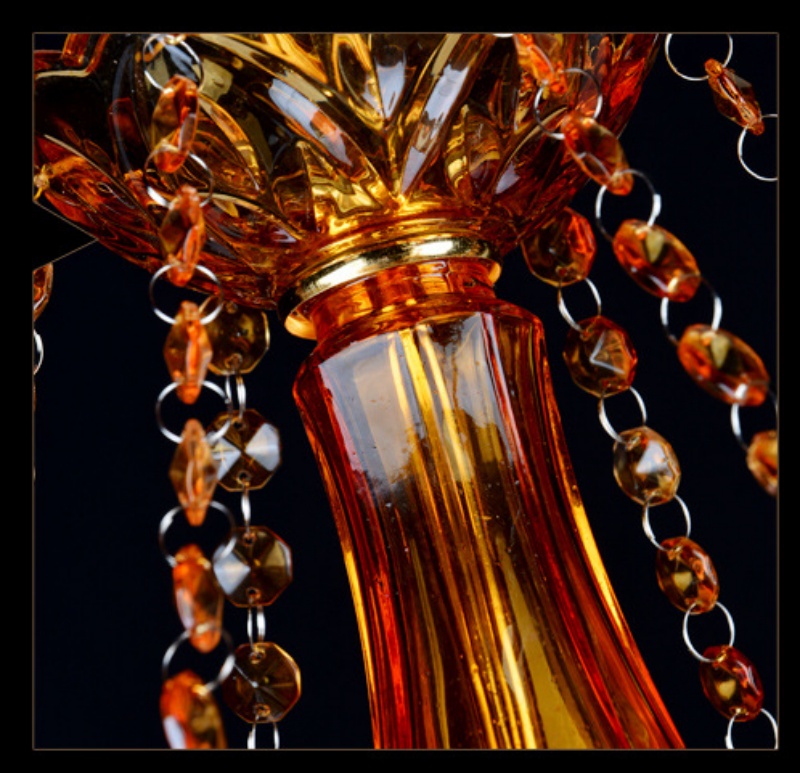 • Rich Amber Hues and Artisanal Detail: The distinctive character of this chandelier is defined by its luxurious materials: a sturdy metal frame, shimmering amber crystals, clear glass candle sleeves, and delicate fabric or chain accents. The warm amber crystals filter light into a rich, golden glow, creating a cozy and inviting atmosphere. The intricate craftsmanship is evident in every detail, from the crystal facets to the ornate metalwork, making this stunning chandelier a masterpiece that adds layers of texture, color, and vintage sophistication to any stately interior.