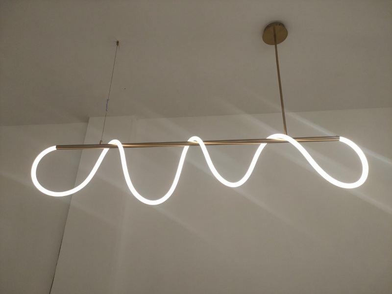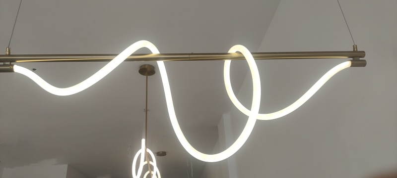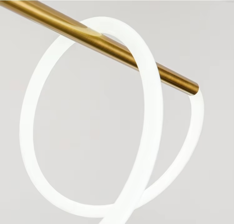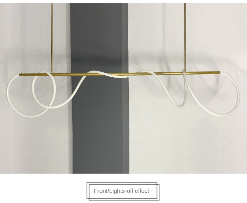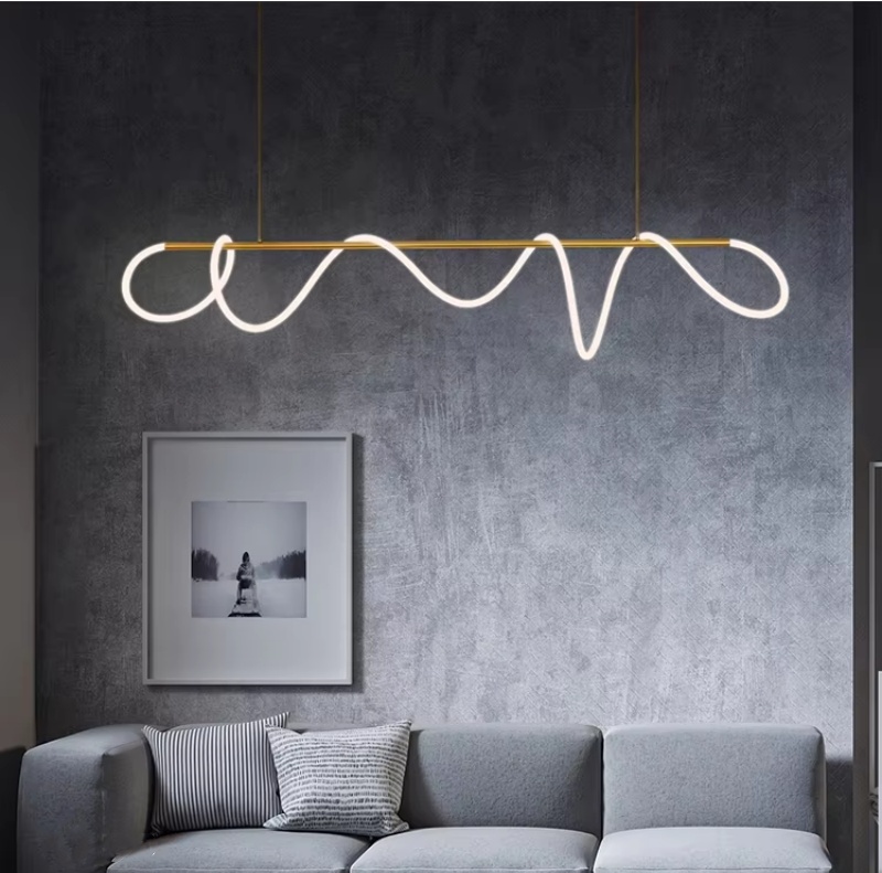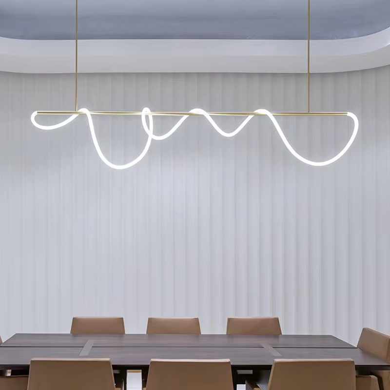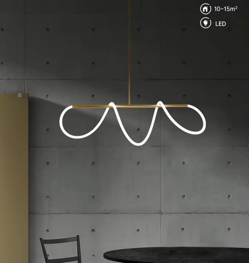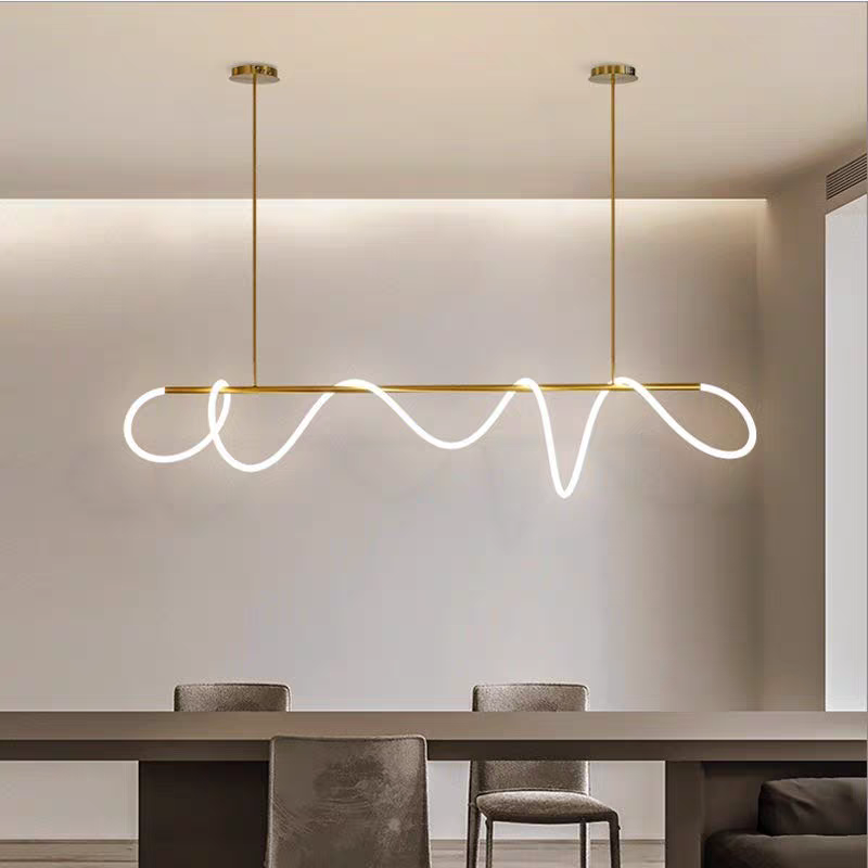- Artistic Linear Design in Gold and White: This gold white linear art pendant lamp showcases a sleek and sculptural form that blends effortlessly with modern interiors. Its elegant linear structure serves as a striking visual statement, making it ideal above dining tables, kitchen islands, or commercial spaces. This pendant lamp combines artistic expression with functional lighting to enhance any environment.