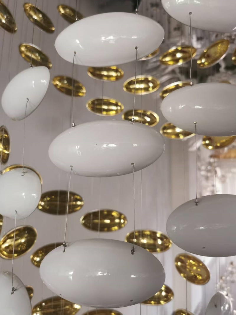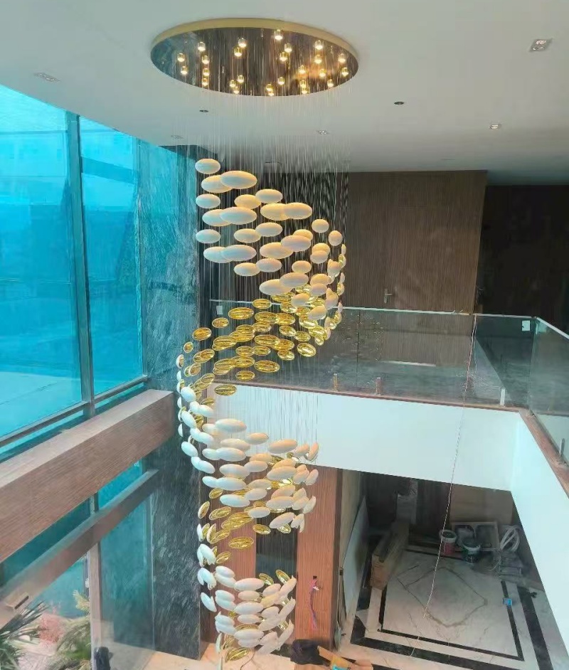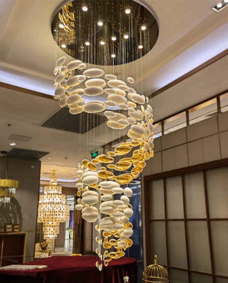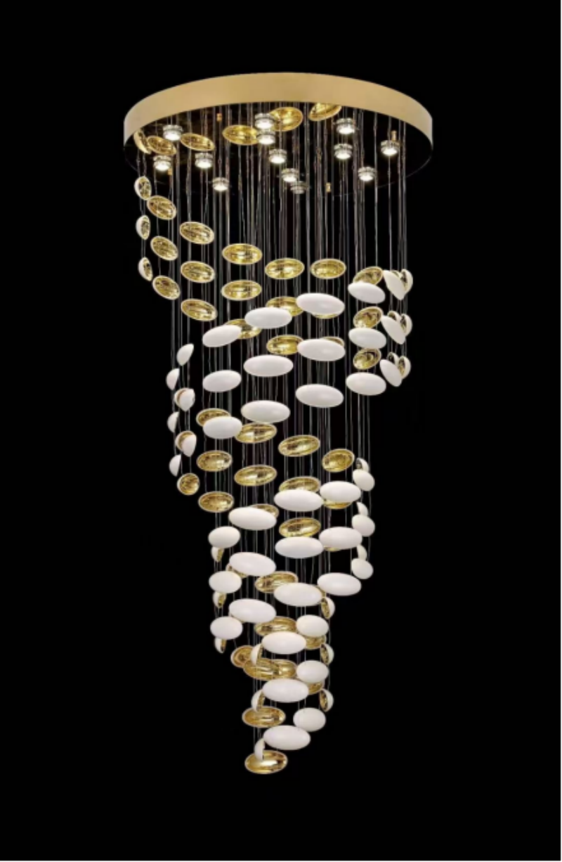 • Luxurious Material Palette: Crafted from premium stainless steel with gold accents and multiple layers of white and transparent glass, this chandelier embodies timeless luxury and modern elegance. The strategic combination of materials in this custom glass chandelier ensures exceptional durability while creating a warm, inviting glow that enhances both contemporary and traditional interiors. The gold and white color scheme maintains its elegant appearance through years of use.