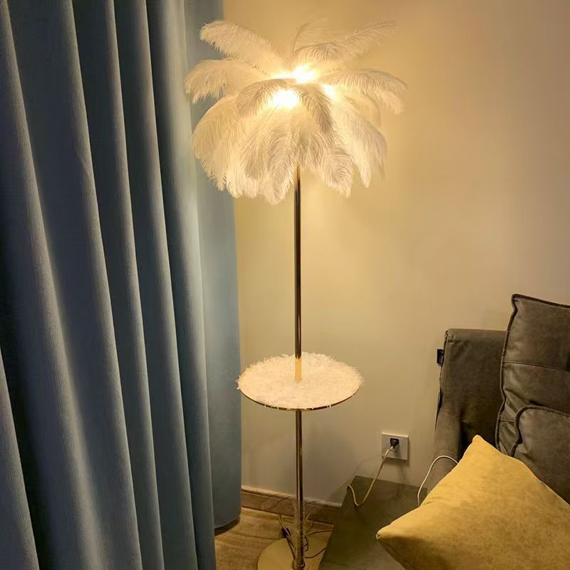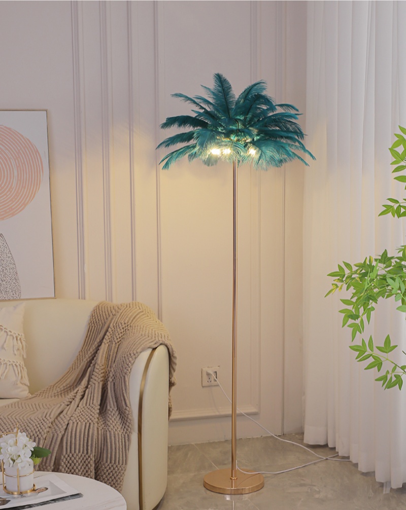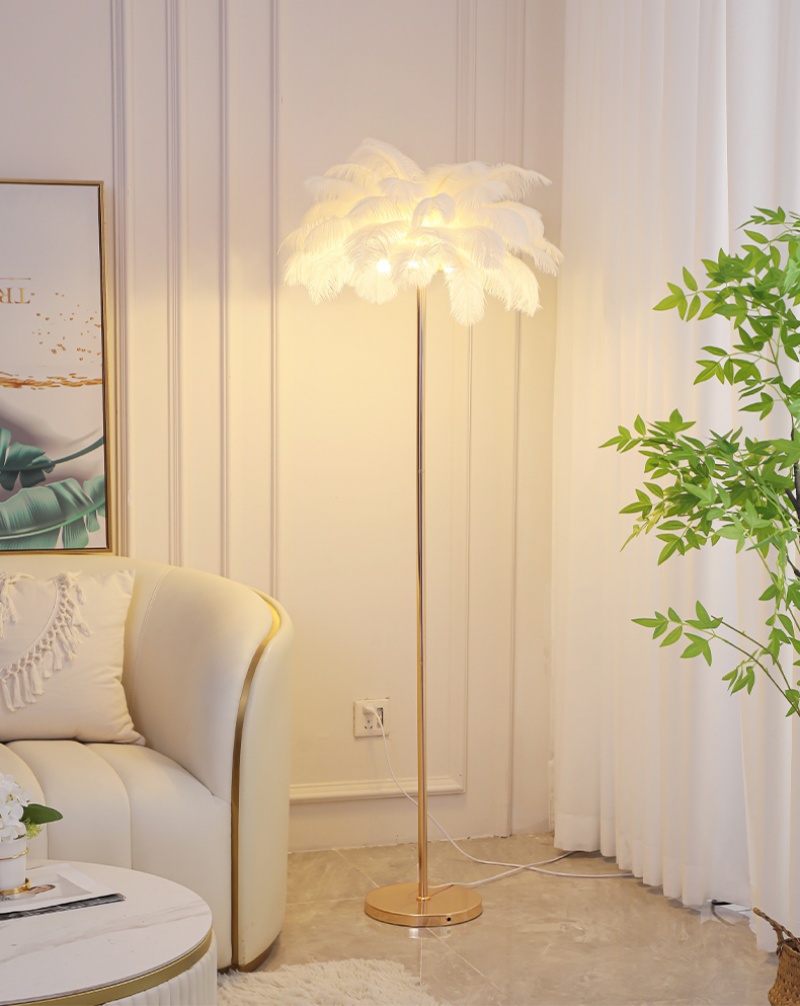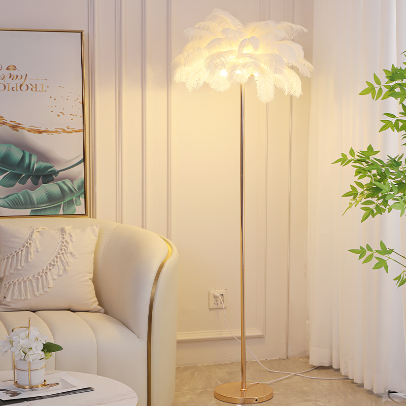 - Stylish Nature-Inspired Floor Lamp Design: This elegant floor lamp is inspired by tropical palm trees, creating a stunning and unique design that brings a touch of nature into your home. The golden metal frame resembles the trunk of a palm tree, while the soft white feathers form a beautiful, feather-like canopy at the top, providing an airy, luxurious look. The warm light emitted from this floor lamp creates a cozy and inviting atmosphere, making it the perfect statement piece for any modern living space.