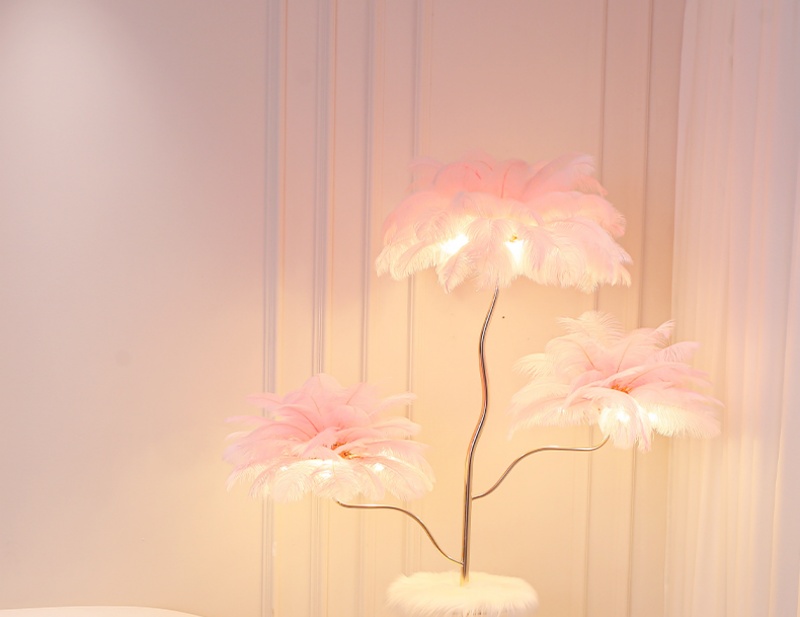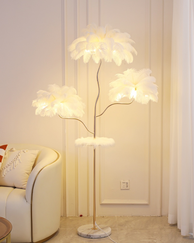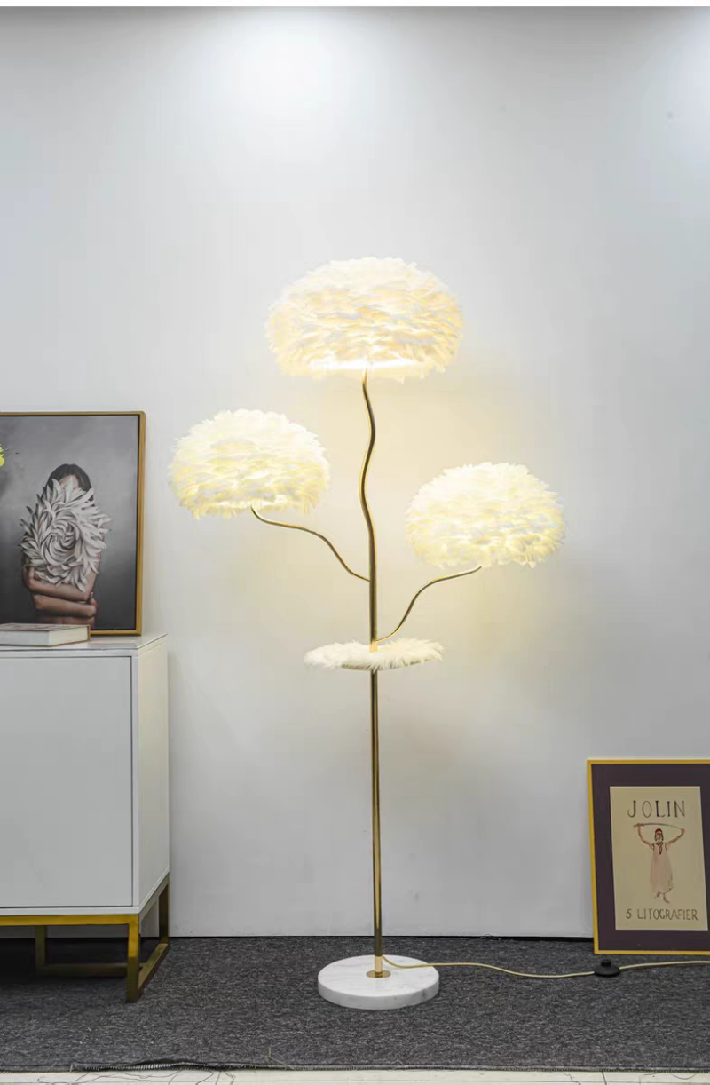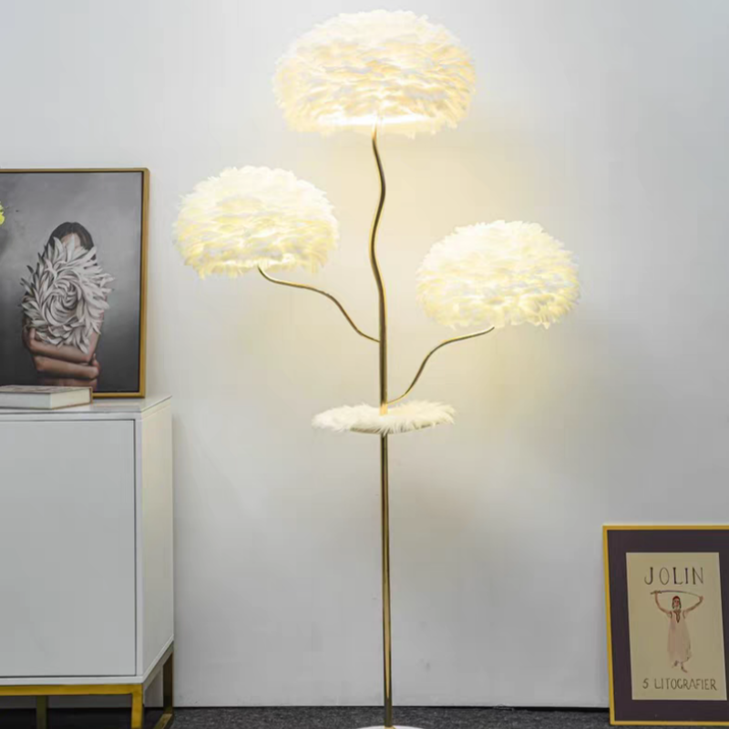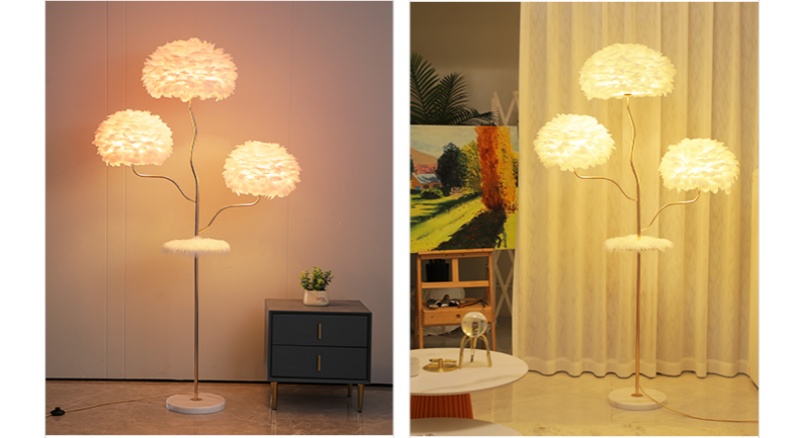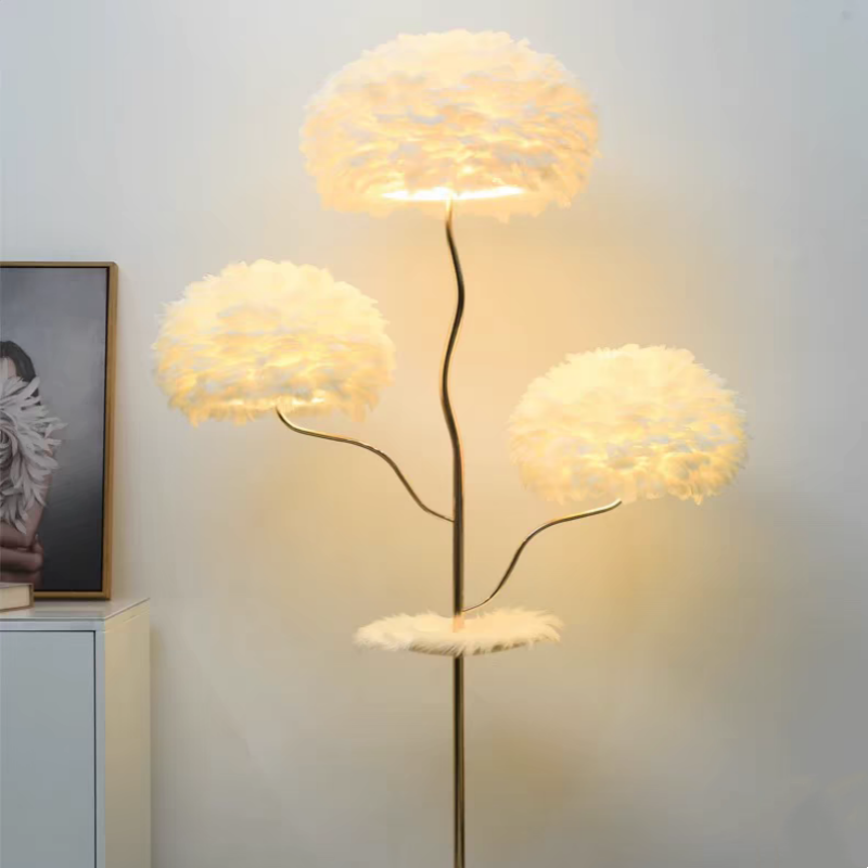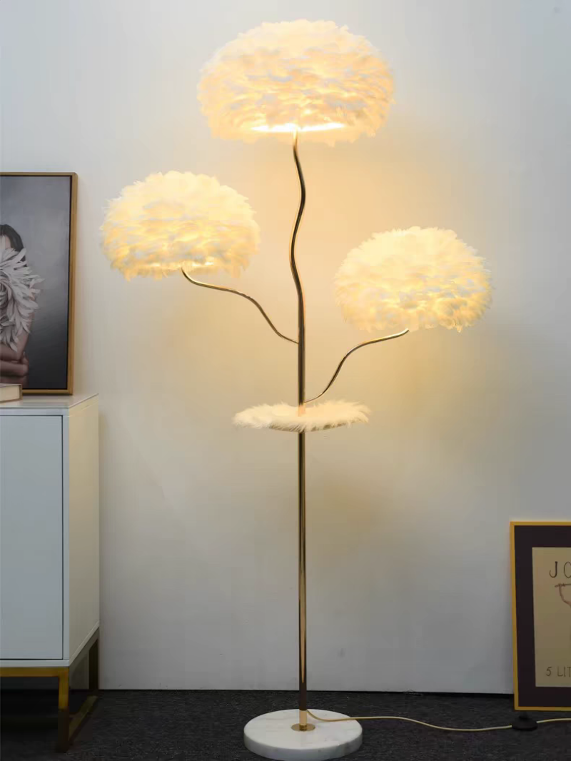 - Creative and Elegant Design: This floor lamp combines modern design with natural elements to create an eye-catching piece for any home. The lamp features three beautifully feathered shades, resembling delicate flowers in bloom. The golden iron frame supports the feathered shades, giving the lamp an elegant and whimsical appearance. It provides a soft, warm glow, creating a serene and inviting atmosphere in your living room, dining room, or any space that could use a touch of luxury.